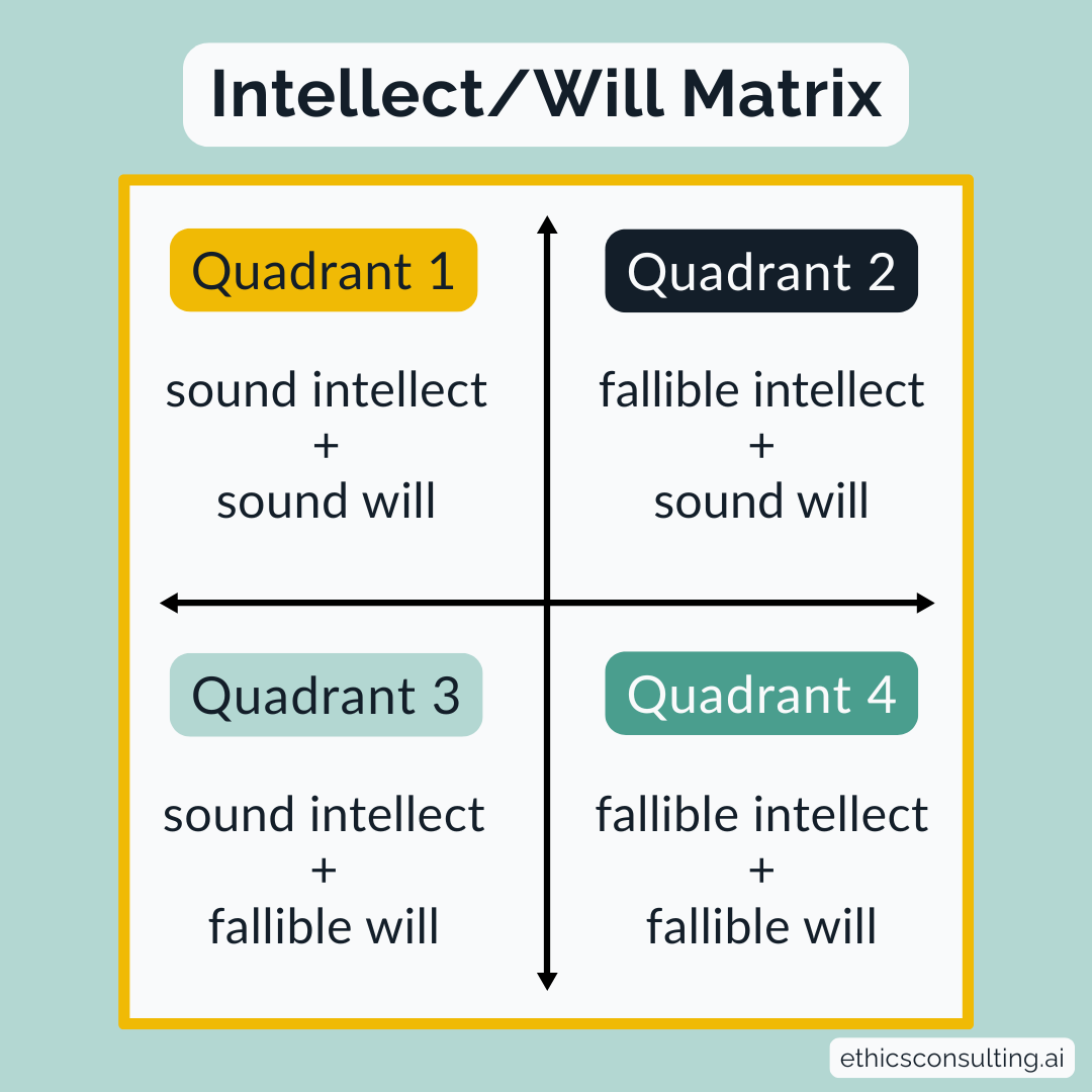 The distinction between intellect and will gives us two axes. The intellect can be sound or fallible. The will can be sound or fallible. Cross them, and you get four quadrants of possibility: